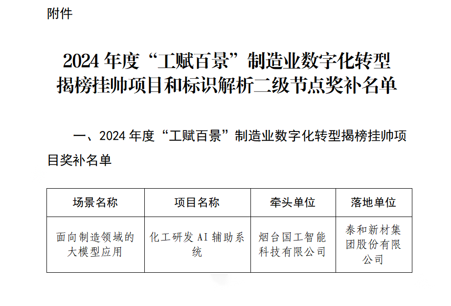 6月3日,省工信廳發布《關于2024年度“工賦百景”制造業數字化轉型揭榜掛帥項目和標識解析二級節點獎補公示名單》,作為全省33個通過驗收的項目之一,由國工智能與泰和新材揭榜掛帥的面向制造領域的大模型應用——“化工研發AI輔助系統”項目榜上有名。