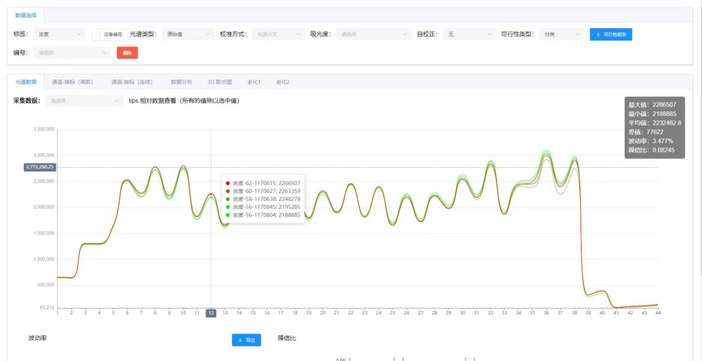 通過光譜對物質(zhì)進(jìn)行檢測產(chǎn)生數(shù)據(jù),上傳至數(shù)據(jù)大腦平臺,數(shù)據(jù)大腦將產(chǎn)生的數(shù)據(jù)進(jìn)行分析可以實(shí)現(xiàn)定量檢測、定性檢測、一致性分析三種功能。