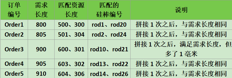 舉個例子,有50 個需求,倉庫中有1000個原料,要在材質(zhì),規(guī)格,長度需求上滿足需求,可拼接,但是每個硅棒需求最多允許拼接2次,可以超長,但是超長的部分不可超過50mm,超長的部分越少越好。