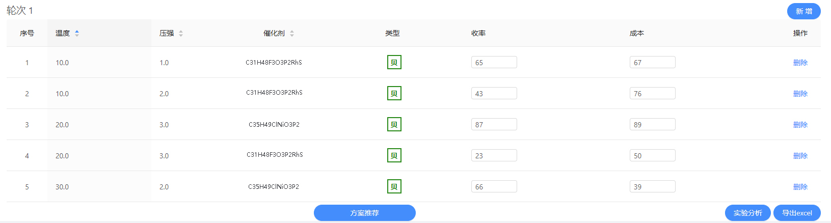 其次,實(shí)驗(yàn)信息配置完成后,即可開始進(jìn)行算法優(yōu)化。在首輪沒有歷史數(shù)據(jù)的情況下,需要隨機(jī)從搜索空間中生成用戶指定個(gè)數(shù)的初始樣本,這里以5個(gè)為例,如圖3為輪次1的信息,這里的收率及成本實(shí)際值需要做實(shí)驗(yàn)進(jìn)行回填,用戶也可以根據(jù)自己的需求刪除一些樣本。