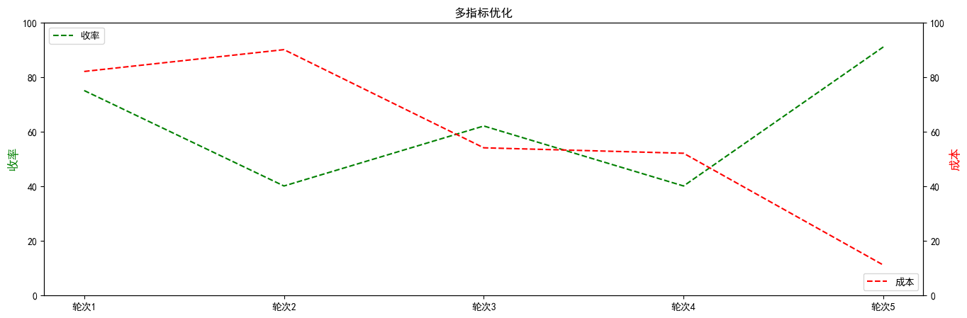 下圖為本示例最終推薦效果的可視化展示,取出每輪推薦方案中指標(biāo)值較優(yōu)的點(diǎn)繪制折線圖,雖有所波動(dòng),但收率整體上朝著最大化的方向進(jìn)行優(yōu)化,同時(shí)成本也在逐漸最小化,并在第5輪推薦方案中二者均達(dá)到了可以接受的水平,證實(shí)了該算法的有效性。