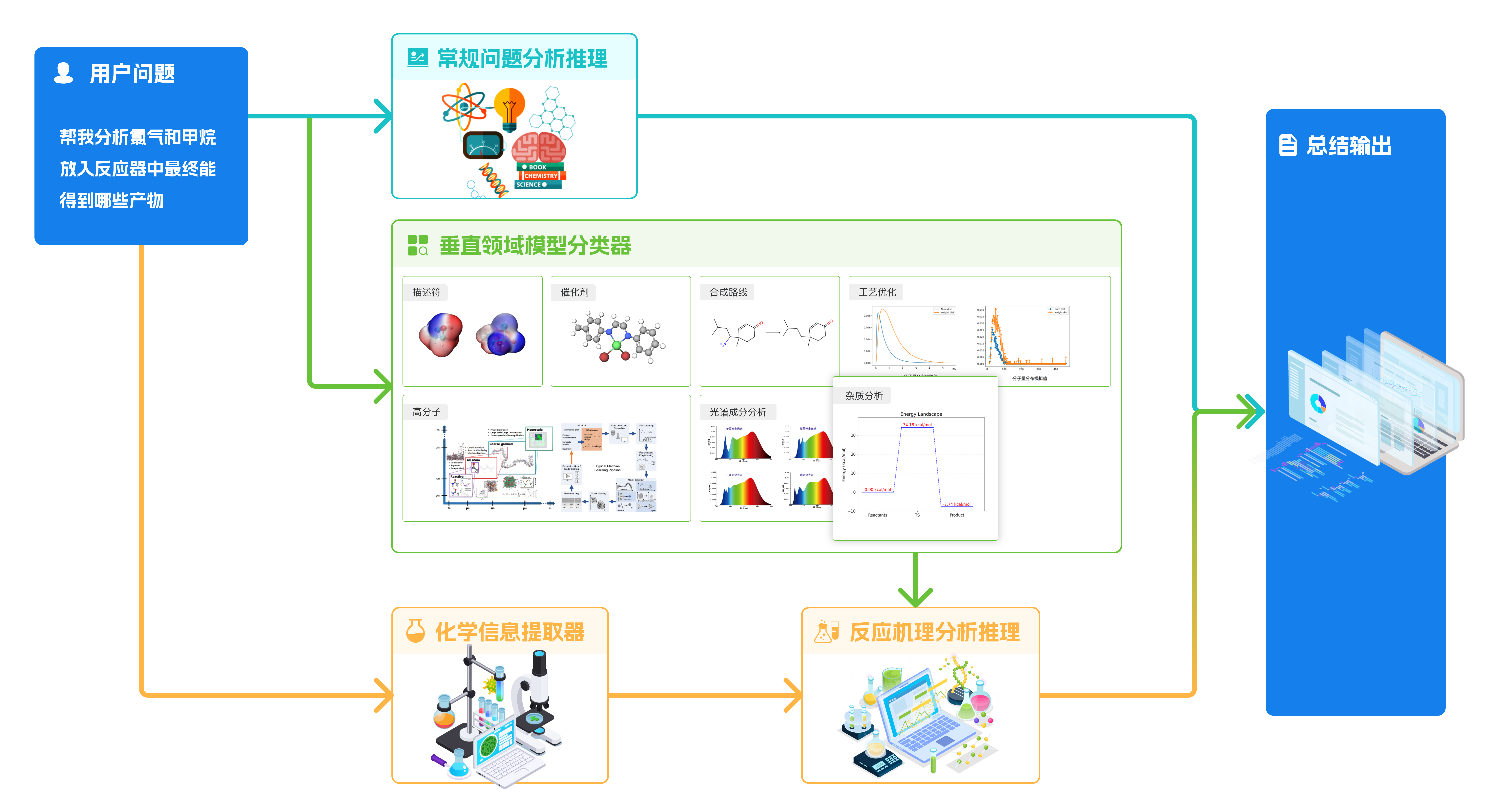 科研模態擴展:「國工化工大模型」的分析回答將不在局限于簡單文本模態。針對不同的機理問題的分析回答時,「國工化工大模型」多種科研模態的圖表形態進行結果展示,包括:「合成路線圖」、「分子3D結構」、「反應勢能面圖」、「過渡態回放動畫」、「能量變化曲線」、「反應演變動畫」、「配方表」、「相關度分析圖」等50種不同科研模態進行結果展示。