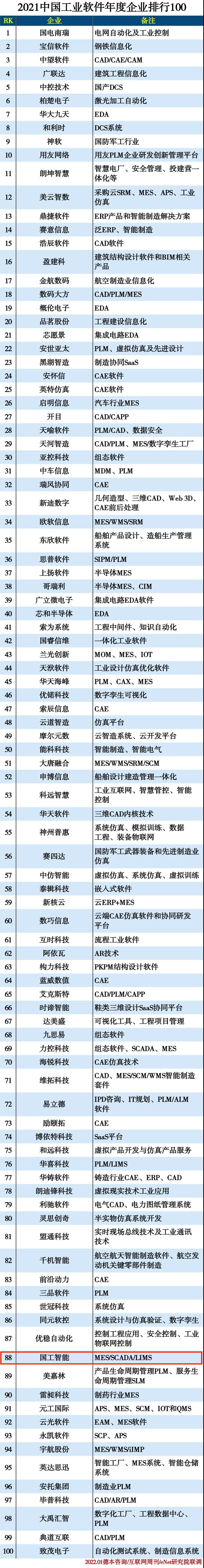 1月10日,《互聯(lián)網(wǎng)周刊》聯(lián)合eNET研究院、德本咨詢發(fā)布了“2021中國工業(yè)軟件年度企業(yè)排行100”排行,國工智能位列第88名!