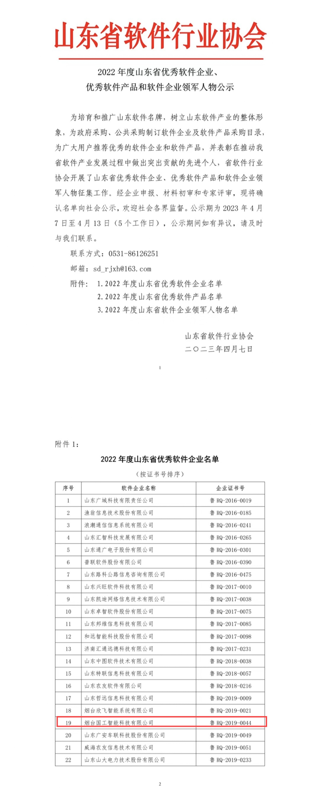 日前,山東省軟件行業協會發布《2022年度山東省優秀軟件企業、優秀軟件產品和軟件企業領軍人物公示》,煙臺國工智能科技有限公司被授予“山東省優秀軟件企業”。