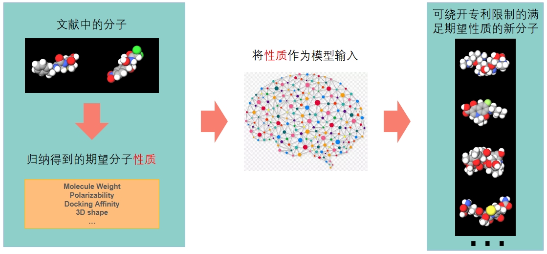 在傳統分子發現流程中,全新可繞開專利限制的分子發現任務往往需要大量專家通過對與文獻中分子相近的極其有限的化學空間進行猜測和嘗試來進行,這大大增加了分子發現流程的周期和成本,也限制了分子的多樣性,對此,分子生成模型通過給定分子的各種約束來逆向生成分子而為分子發現提供了一種新的解決方案。